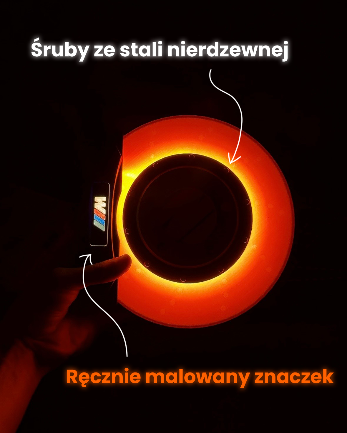 Stosujemy śruby ze stali nierdzewnej i ręcznie malujemy logotypy, dzięki czemu lampa wygląda solidnie, a wykończenie nadaje jej charakteru.