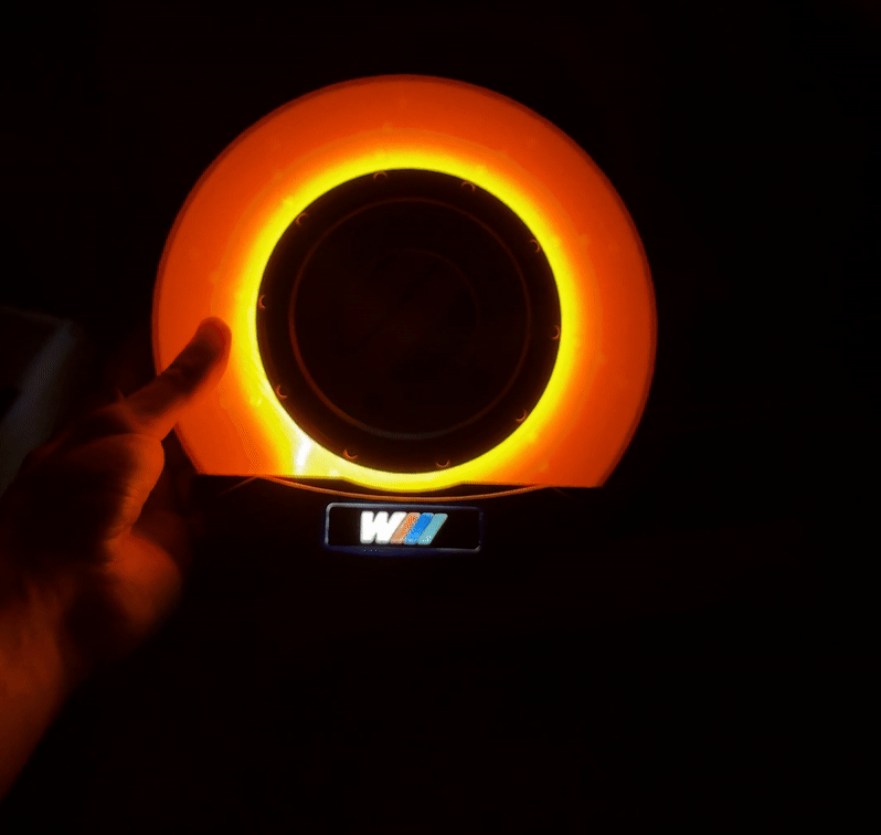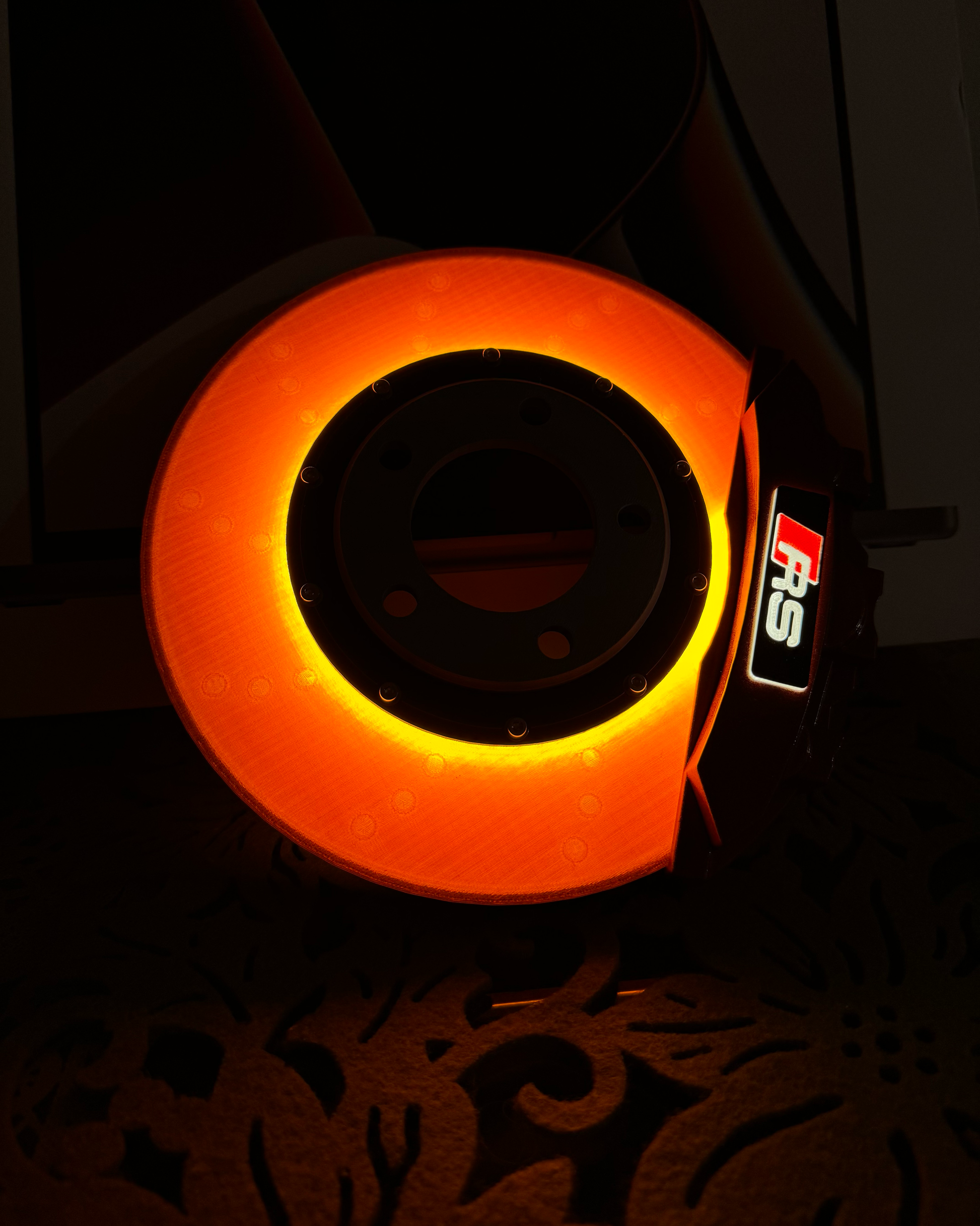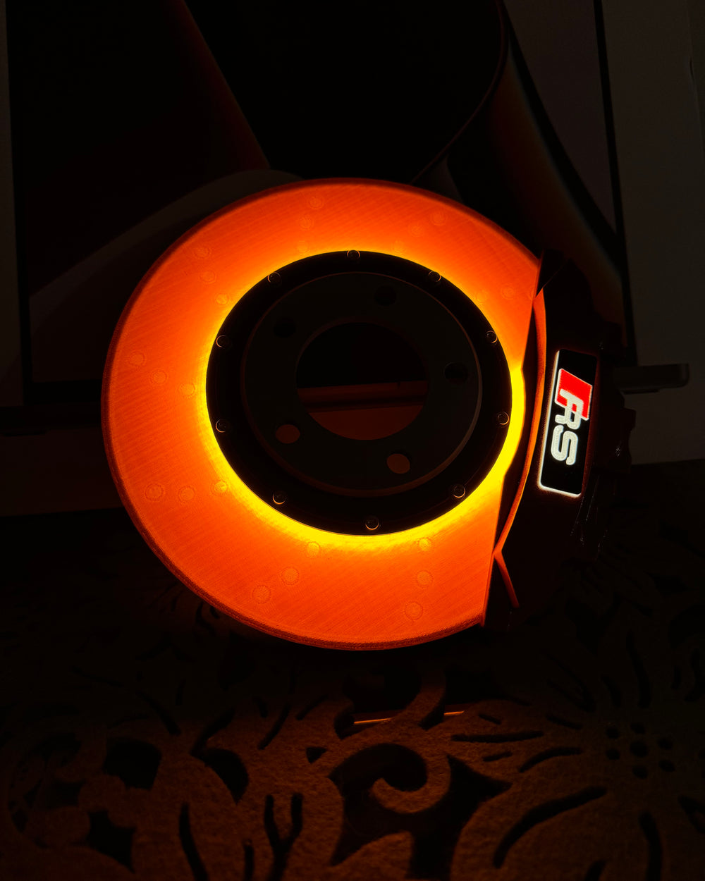 Efekt rozżarzonej tarczy hamulcowej tworzy realistyczny wygląd „rozgrzanego rotora” łącząc w sobie funkcję dekoracyjną i wyjątkowego światła nastrojowego.